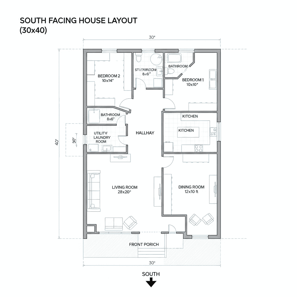 Let’s visualize a common south facing house vastu plan 30×40, which is popular in Indian cities.